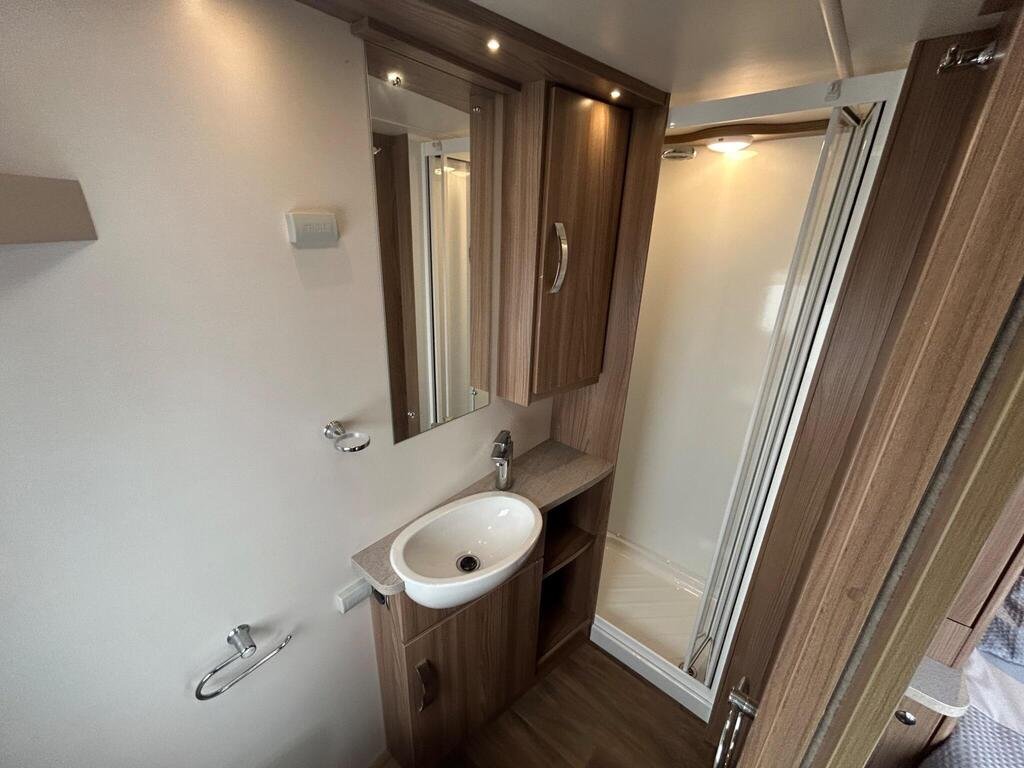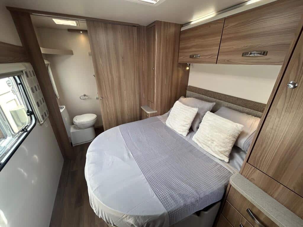 The washroom is large and well laid-out, featuring a separate shower cubicle, cassette toilet, basin and storage – right across the width for maximum comfort. Extras make this Astbury shine: solar panel, motor mover (Reich Auto Engage), leisure battery with good capacity, external BBQ point, and alloy wheels. These enhancements improve both convenience and self-sufficiency on site or when you’re off the grid.