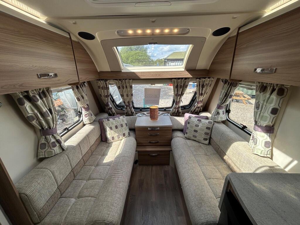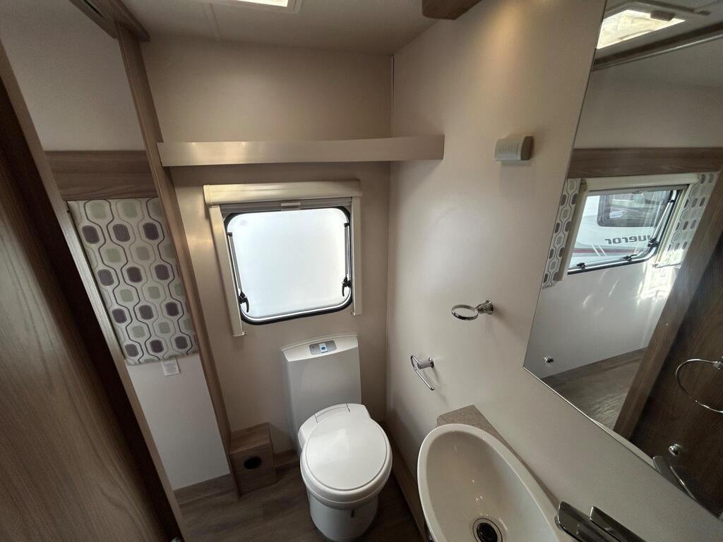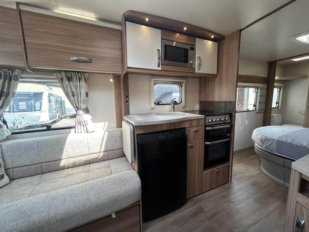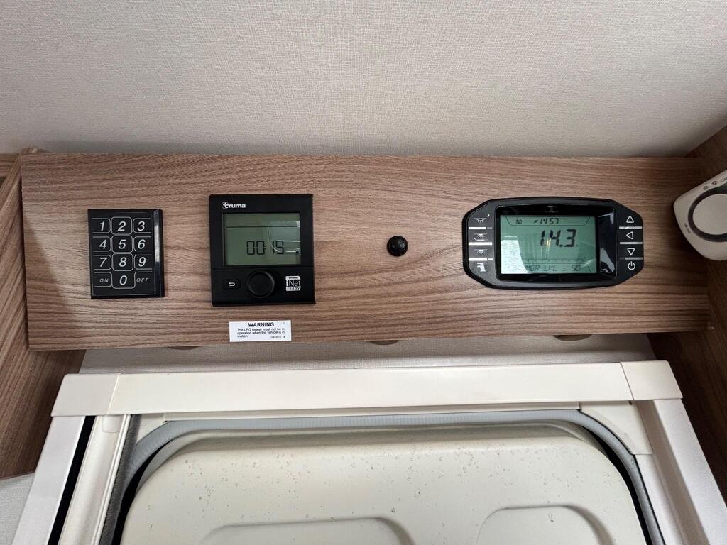 The kitchen is well equipped to handle all your culinary needs. Full cooker, microwave, fridge/freezer, sink and worktops are neatly arranged. For warmth and hot water, there’s a Truma Combi boiler system ensuring reliable performance whatever the weather. The living space is enhanced with high-grade furnishings (Brinkley style), timber-less construction and durable GRP body panels that resist dents and the elements.