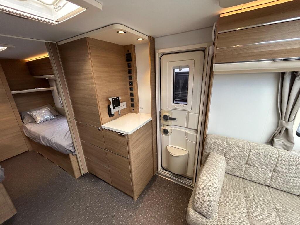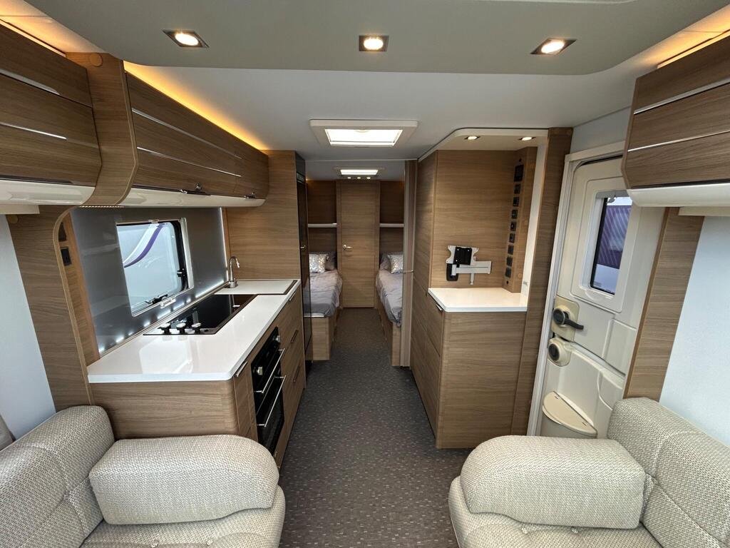 Step inside and experience a spacious front lounge that easily converts into a generous double bed, complemented by two luxurious fixed single beds towards the rear. The central kitchen is equipped with a full oven, grill, 3-burner gas hob, microwave, and a large fridge freezer, ensuring you have all the amenities you need for comfortable touring. The washroom features a separate shower cubicle and high-quality fixtures, giving you the convenience of home on the road.