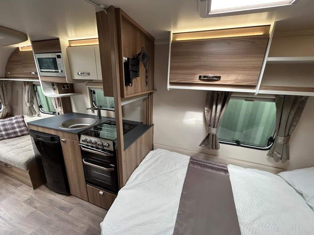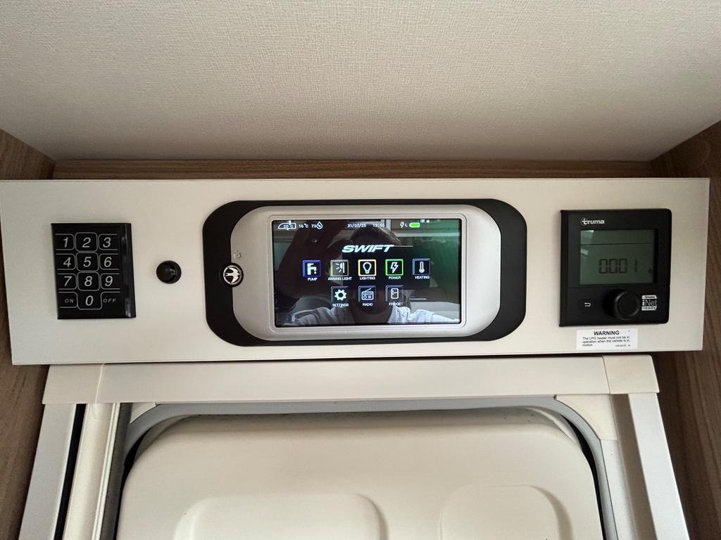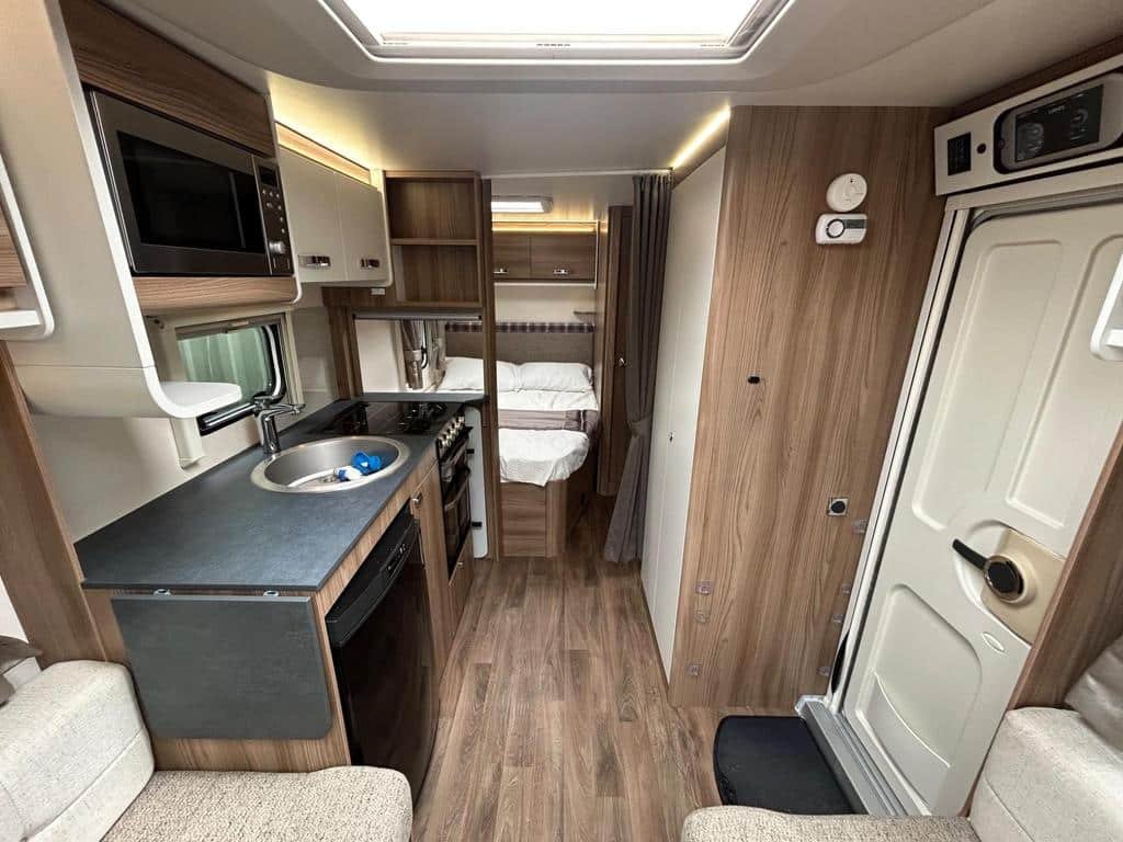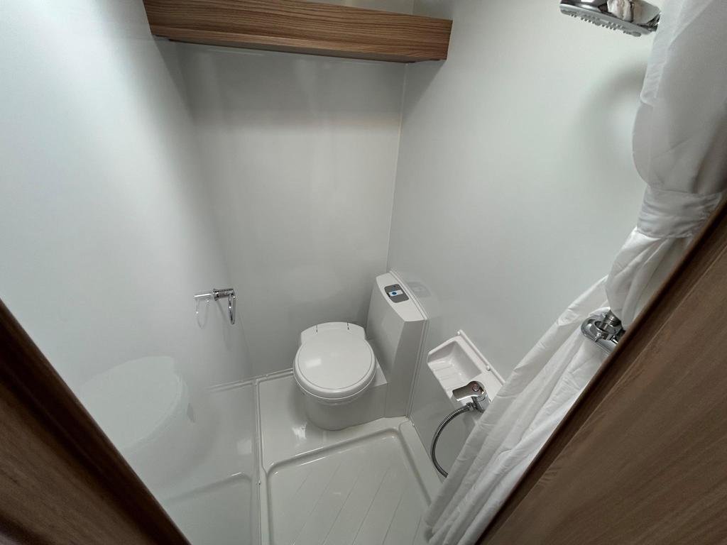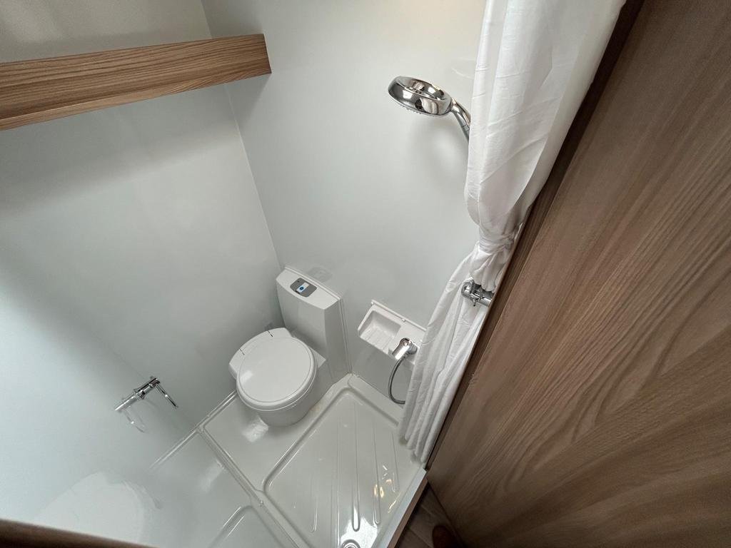 The well-equipped kitchen includes a sleek Thetford oven and grill, a 3-burner gas hob, a microwave, and a generously sized fridge freezer, ensuring you can prepare meals just like at home. The contemporary washroom is fitted with a fully lined shower cubicle, vanity unit, and cassette toilet, giving you all the comforts you need for life on the road.