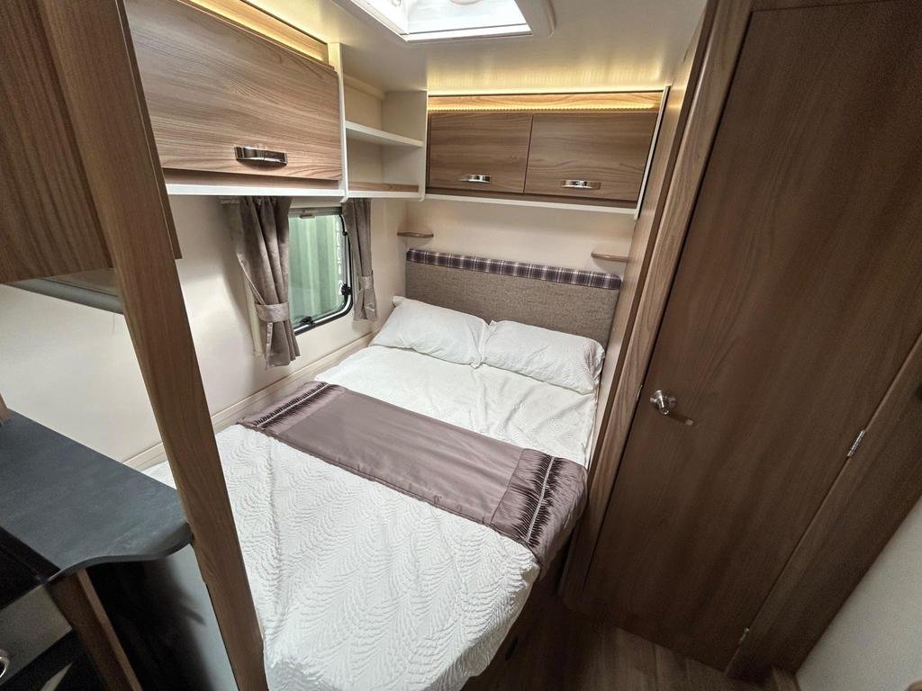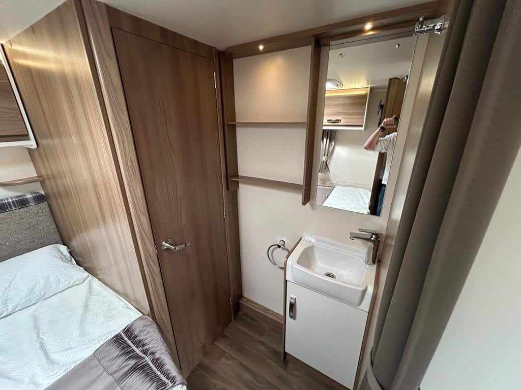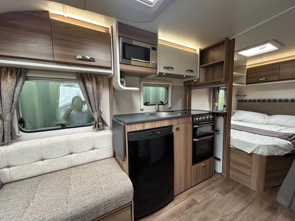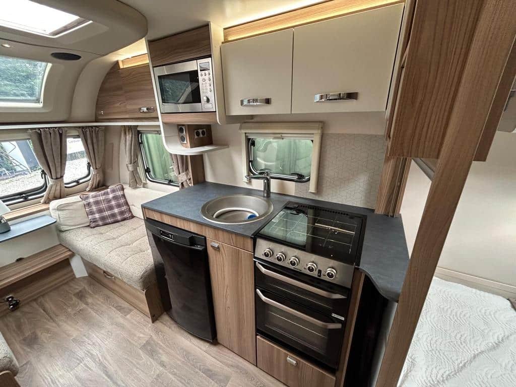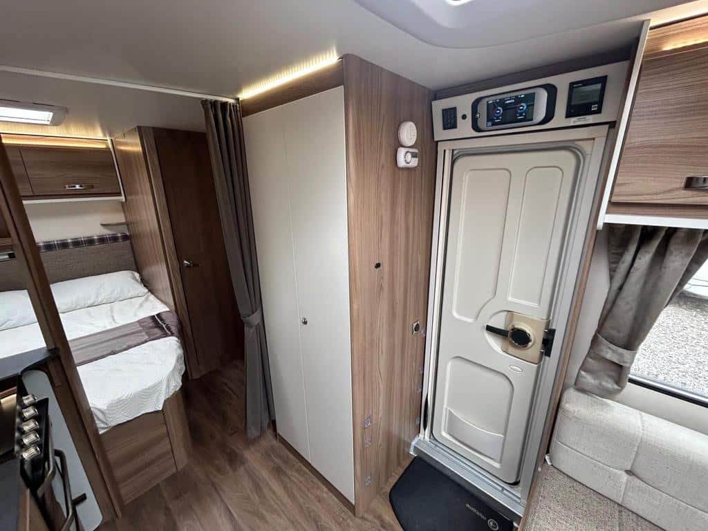 The well-equipped kitchen includes a sleek Thetford oven and grill, a 3-burner gas hob, a microwave, and a generously sized fridge freezer, ensuring you can prepare meals just like at home. The contemporary washroom is fitted with a fully lined shower cubicle, vanity unit, and cassette toilet, giving you all the comforts you need for life on the road.