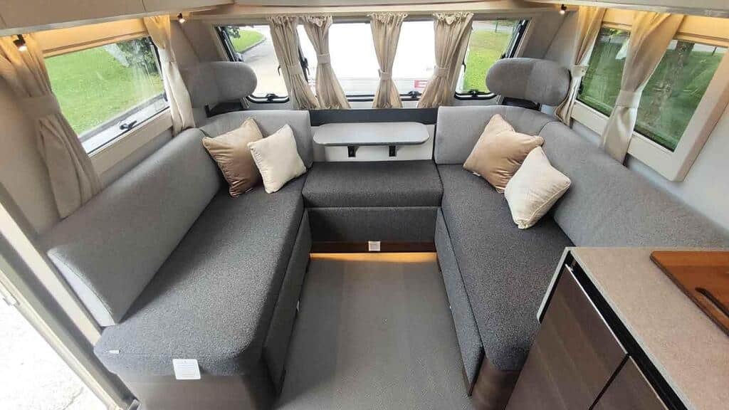 The Adora 612 DL Seine greets you with a bright and airy interior, highlighted by Adria’s signature panoramic roof window that draws in natural light and opens up the space. With sleeping for 5, it offers a front double (217 × 154 cm), a middle twin/single configuration (203 × 77 cm and 189 × 77 cm), ensuring flexibility for guests or family, and room to stretch out. Superb insulation (walls, roof, floor – 40/24/29 mm) maintains comfort across all seasons. Heating is handled by the premium Alde system to keep chills away during cooler plots or off-peak trips.